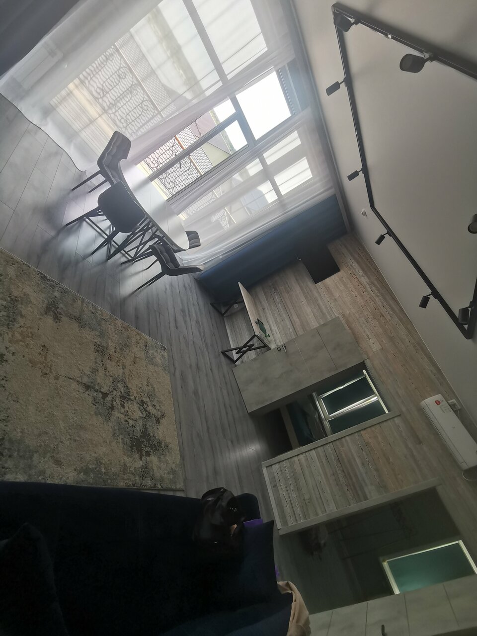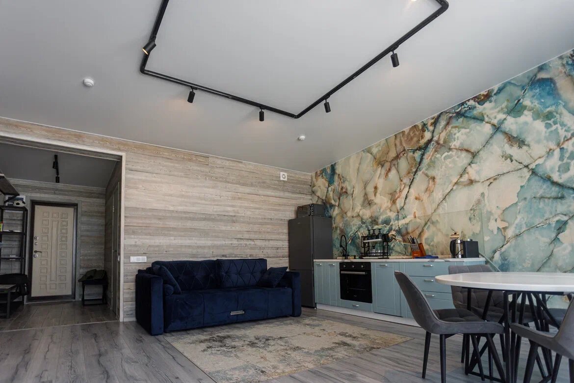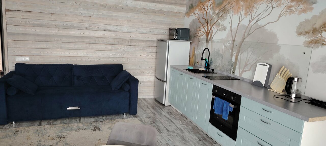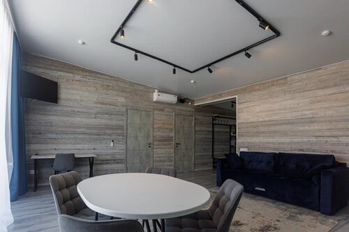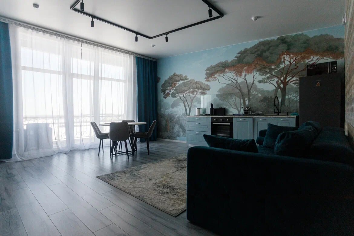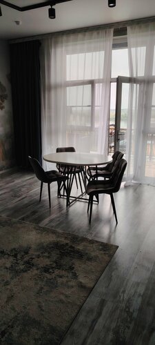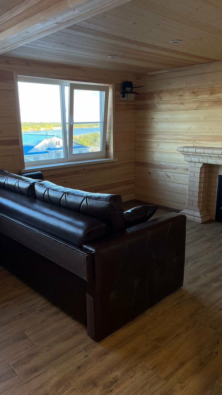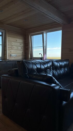 В гостинной большой диван, телевизор, огромная панорама с видом на Оку, стол который раздвигается, много разной посуды для готовки. Есть парковочные места чтобы загнать машину. Остались очень доволтеы посещением.
